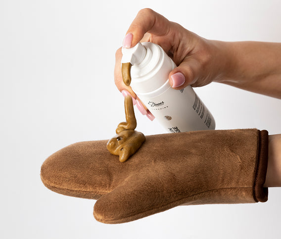 - Nałóż niewielką ilość pianki samoopalającej (np. JoySun Mousse) bezpośrednio na rękawicę.